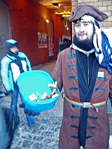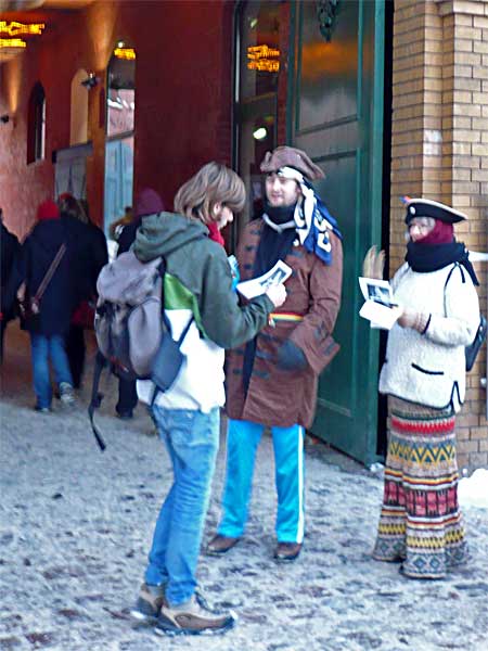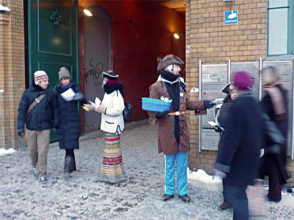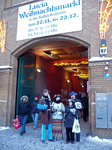 Cpt. Nodus, Elli Spirelli und ich waren ganz pünktlich vor Ort. Aber wo waren die Anderen? Wir wollten nicht lange nutzlos im Kalten rumstehen und fingen schon mal an, Flyer und Fleischbällchen zu verteilen. Beides ging ab wie warme Semmeln. Als Spaghettine und Makaronski, die Abordnung aus Potsdam, anriefen und uns mitteilten, sie würden eine Bahn später kommen, hatten wir schon einige Besucher mit der wahren Geschichte Weihnachtens beglückt. Mit ner Viertelstunde Verspätung angekommen schnappten sich die beiden eine Stapel Flyer und waren, als alte Hasen, ohne großes Aufwärmen sofort mitten im Geschehen.