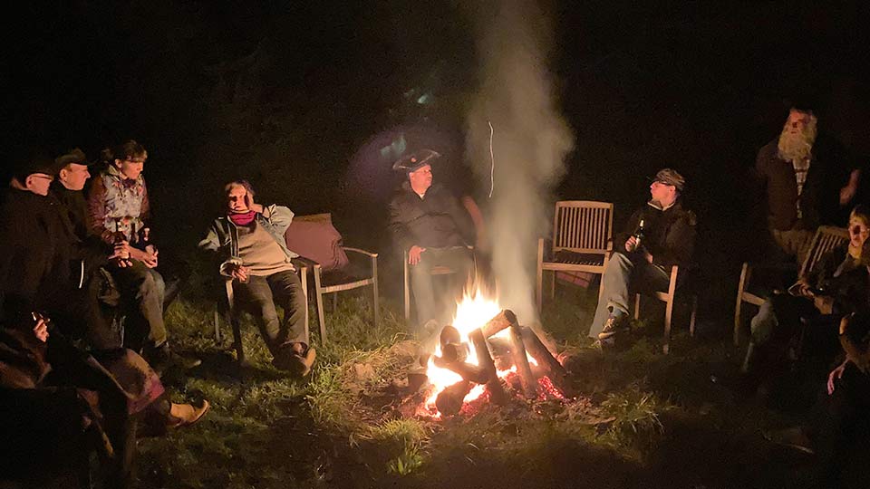 Angefangen mit dem kleinen Umtrunk am Lagerfeuer direkt am Gründungsort der Kirche bei Fettstullen und Gürkchen.
