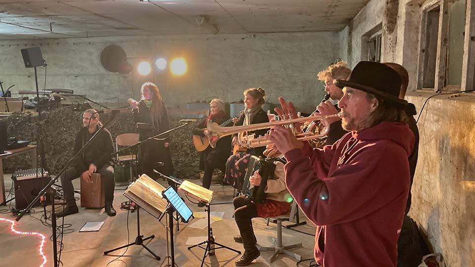 Das UFO (Uckermärkische Folkorchester) baute seine Anlage auf, wir eine Leinwand und den Beamer. Schließlich hatten wir zwei Grußworte bekommen. Zuerst das italienische,
