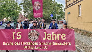 Am Heiligen Abendmahl nahmen dann über 40 Personen teil und hatten großen Spaß an „Nudeln von SEINEN nudligen Anhängseln“ und „Bier von SEINEM Biervulkan“.