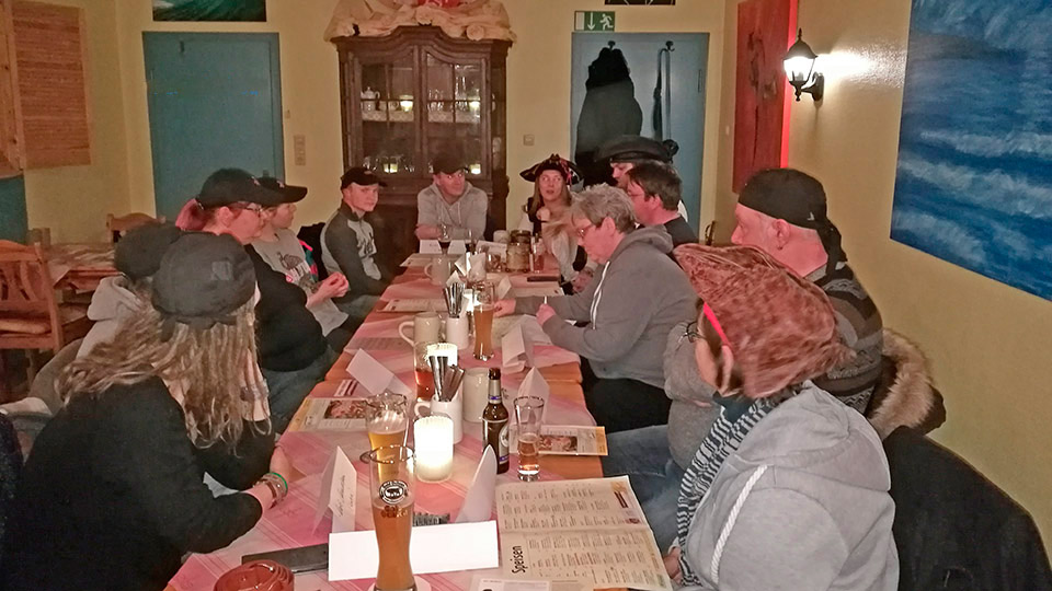 Da unsere Kaperfahrer nun auch genügend Durst und Hunger hatten, wurde es im Anschluss doch teilweise recht ruhig, denn die köstlichen Nudelgerichte und Nudeltöpfchen wurden zu den großen Bierhumpen gereicht.