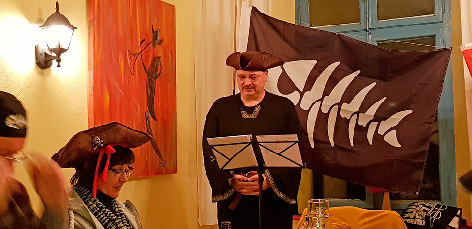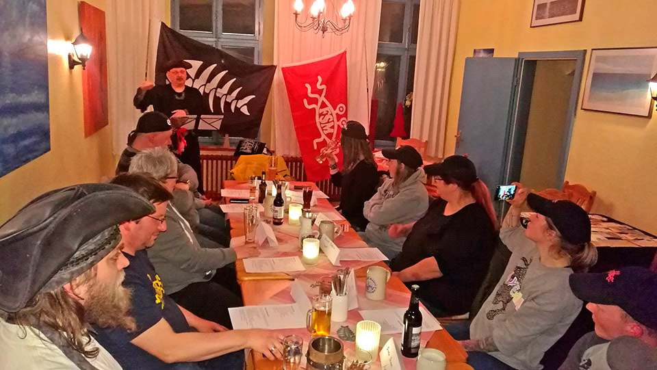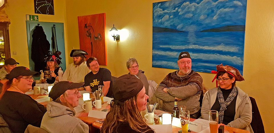 Im Restaurant „Mathes Nudeltöpfchen“ war schon alles für ein gemeinsames Nudelmahl und die Nudelmesse vorbereitet. Ein mit maritimen Bildern geschmückter Raum bot genügend Platz, denn zu diesem Treffen heuerten 15 Pastafaris an. Vor kurzer Zeit erst vom FSM erleuchtete Pastafaris trafen nun auf erfahrene Seebären und Piratinnen.