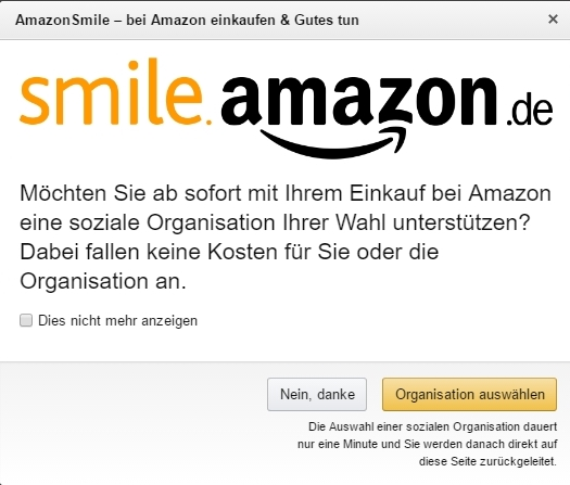 Von dieser Möglichkeit hatte ich noch nichts gehört und deshalb nachgeforscht. Tatsächlich, diese Möglichkeit gibt es und ab und an fordert amazon direkt dazu auf. Wenn man das möchte, kann man einer Organisation seiner Wahl 0,5% der Einkaufssumme von Amazon weiter geben lassen. Richtig, ohne selbst etwas dafür zu zahlen.