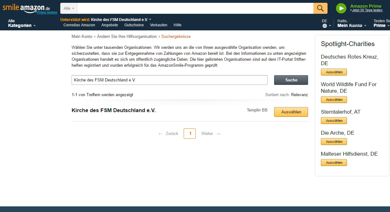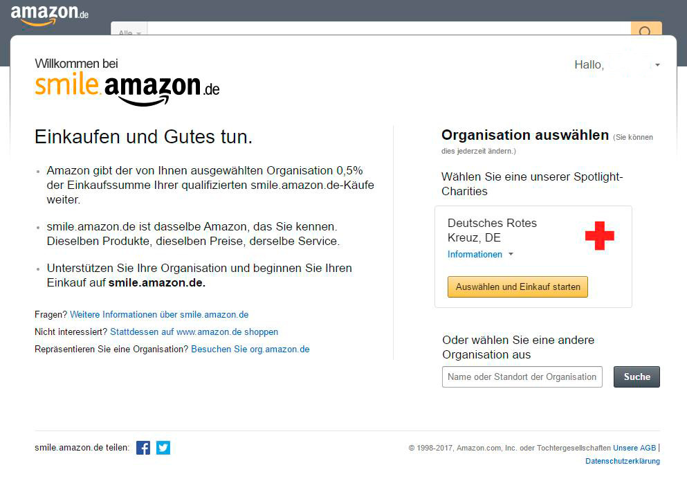 „Bei amazon soll ich unter dem Motto „Einkaufen und Gutes tun.“ eine Organisation eintragen, die für jeden Einkauf eine Provision erhalten soll. Kann ich euch dort eintragen und wenn ja wie?“