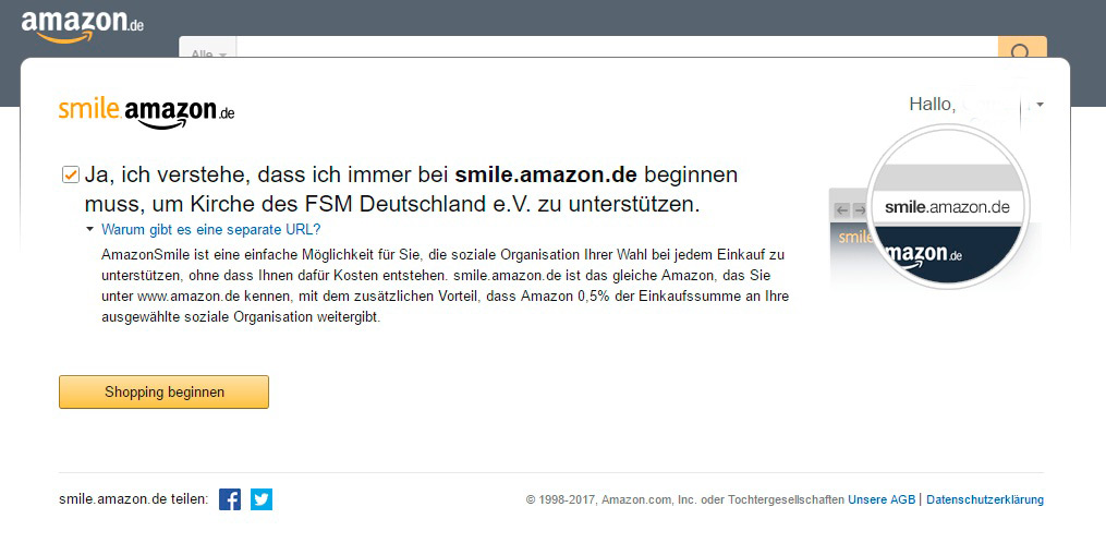 Dann geht es weiter mit dem Einkauf. Wenn dabei angezeigt wird „Unterstützt wird Kirche des FSM Deutschland e.V.“ hab ihr alles richtig gemacht.