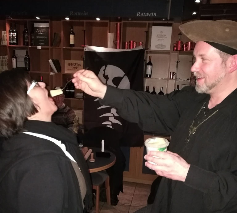 Würdevoll hielt Guybrush Rigatoni die Nudelmesse, berichtete von den Begebenheiten auf seiner Anreise und wies auf den Unterschied unserer Monsteranz zu den Gebilden der Abergläubischen hin. Denn wir sind natürlich keine Kannibalen, die Fleisch eines fiktiven Untoten oder gar dessen Blut verspeisen. Nein, die Monsteranz weist uns auf die Existenz SEINER nudeligen Anhängsel hin und jeder Pastafari weiß, dass es sich bei der Nudel im inneren nur um ein Symbol handelt. Im Anschluss an Monsterunser und Predigt verteilte unser Nudler Guybrush Rigatoni die Nudeln von SEINEN nudeligen Anhängseln an die Gemeindemitglieder.