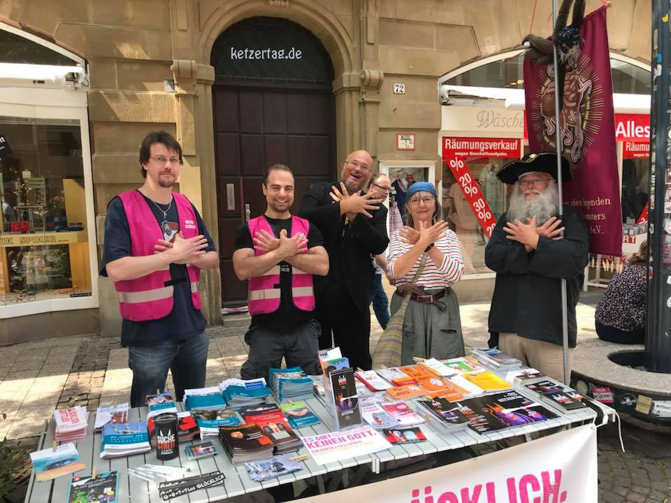 Ihn fanden wir am gut besuchten Info-Stand der Ketzer. Die Zustimmung der Passanten, die im Vorbeigehen anerkennende Worte fanden oder sich am Stand Informationsmaterial abholten und Zuspruch für unsere Aktion verlauten ließen, war erstaunlich.