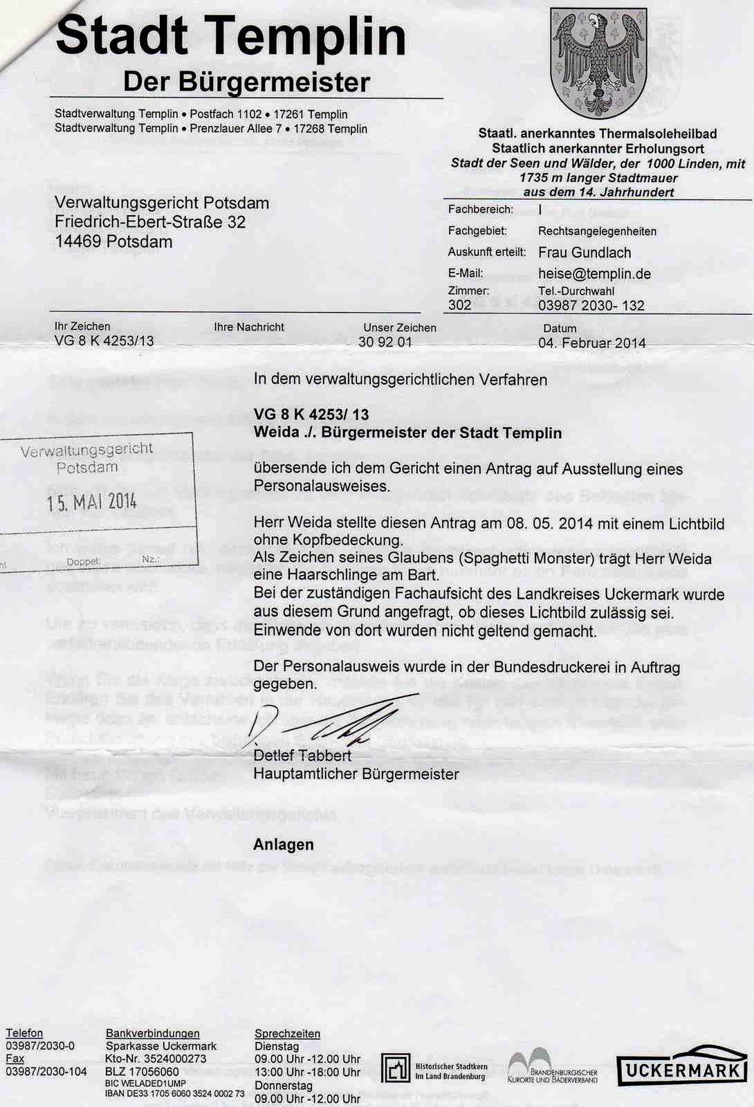 Falls das ein Fehler war, bin ich gern bereit nochmals einen Antrag auf Ausstellung eines Personalausweises mit Kopfbedeckung zu stellen und notfalls ein neues Verfahren zu eröffnen. Ich bitte jedoch darum, sowohl aus Zeit- als auch aus Kostengründen, weiteres Bestehen des Rechtsschutzinteresses festzustellen. Haarschlingen kommen in meinem Glauben nicht vor. Meine kann deshalb keinesfalls, wie vom Bürgermeister der Stadt Templin scheinbar vermutet, als Ersatz für die verweigerte Kopfbedeckung gesehen werden, sondern lediglich als modischer Gag.