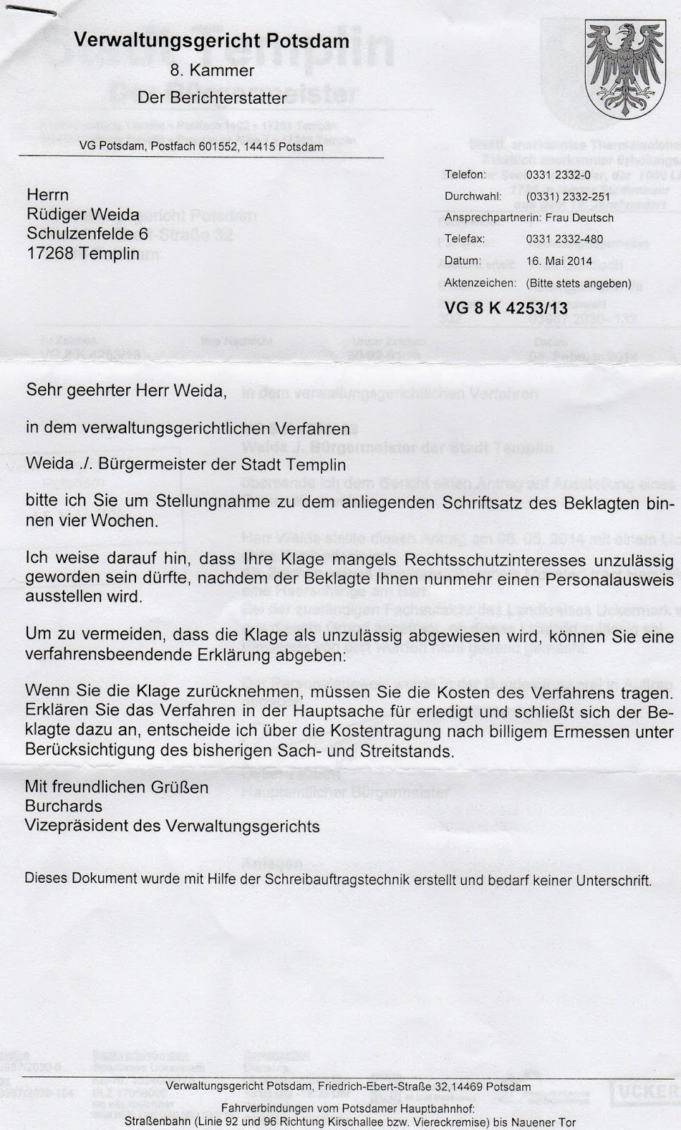 Die Freude währe aber nicht lange, ich bekam Post vom Verwaltungsgericht Potsdam.