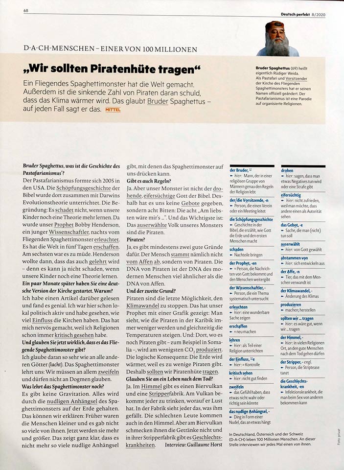 Alle anderen Berichte waren aber wirklich gut. Angefangen hat es mit der Zeitung des Goethe Instituts. Deren Zeitschrift “Deutsch perfekt” wird zum Unterricht in deutscher Sprache verwendet. In der obigen Ausgabe auch mit einem Interview mit mir. Wenn das nichts ist, weltweit erfahren nun also Deutschschüler vom Fliegenden Spaghettimonster.