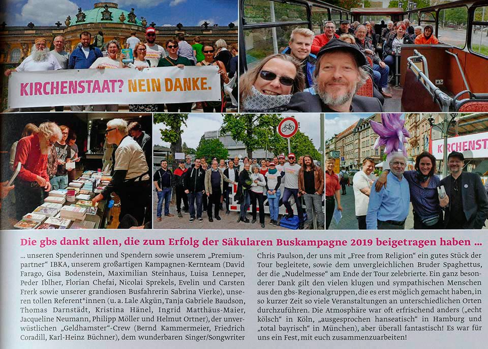 Die dritte Zeitschrift, die über uns berichtet, ist die “bruno”, das Jahresmagazin der Giordano – Bruno –  Stiftung. Dort kommen wir gleich zweimal vor, einmal beim Evolutionsweg und ein weiteres Mal bei der Buskampagne. Das Magazin kann übrigens kostenfrei hier bestellt werden.