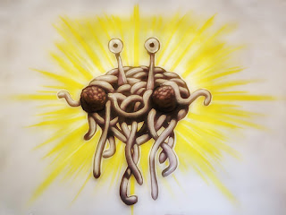 Dieses nun ist aber unübersehbar. Ein Bild hat sich manifestiert, ein Bild von Ihm. Das nicht irgendwo, nein, sondern genau in dem Gebäude, das wir im September zur ersten Pastafarianischen Kirche in Deutschland weihen, genau in dem Raum, der unsere Reliquien beherbergen wird und genau an der Wand, auf der wir Ihm zu Ehren einen Altar errichten wollen.