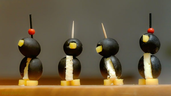 So nennen manche von uns den Passtahsonnabend. Katerstimmung hier und da! Ganz wichtig, sobald der Pirat zur Nahrungsaufnahme bereit ist, sind Rollmops, Brathering, Heringshäckerle. An diesem Tag bleibt die Küche sowieso in den meisten Haushalten gern kalt. Der Sonnabend ist der Feiertag mit den schlechtesten Karten, um zu glänzen. Wer zuvor zu ausgelassen feierte, sieht zu, dass er für den Passtahsonntag wieder ansehnlich aus den Piratenfestgewändern schaut. Der Rest der Crew muss doppelt hart ran, denn nun sind die Vorbereitungen für den Passtahsonntag unvermeidlich. Es wird gekocht, gebacken, Eier so bunt gefärbt, dass sie den schmucksten Papagei blass aussehen lassen. Die Kinder verkrümeln sich an diesem Tag beizeiten. Für sie ist das der wichtigste Feiertag. Die jungen Piraten ziehen ins Freie, um gemeinsam zu spielen. Natürlich gibt es dabei auch ein kleines Picknick. Traditionell machen die kleinen Freibeuter dabei Pinguinen den Garaus. Die haben sie vorher aus Oliven, Käse und Möhren selbst gebaut. Das geht wirklich einfach, das schafft jeder.