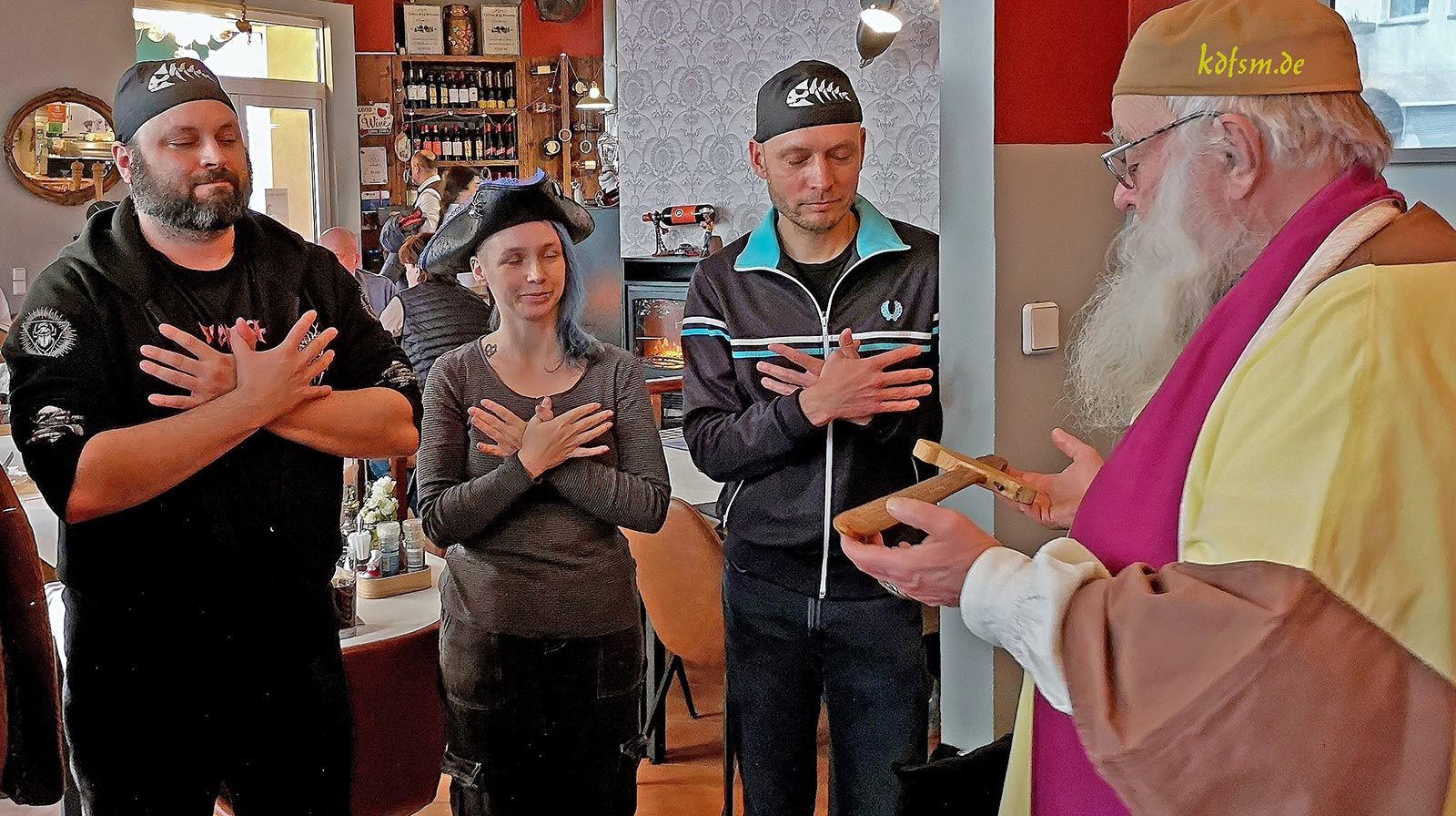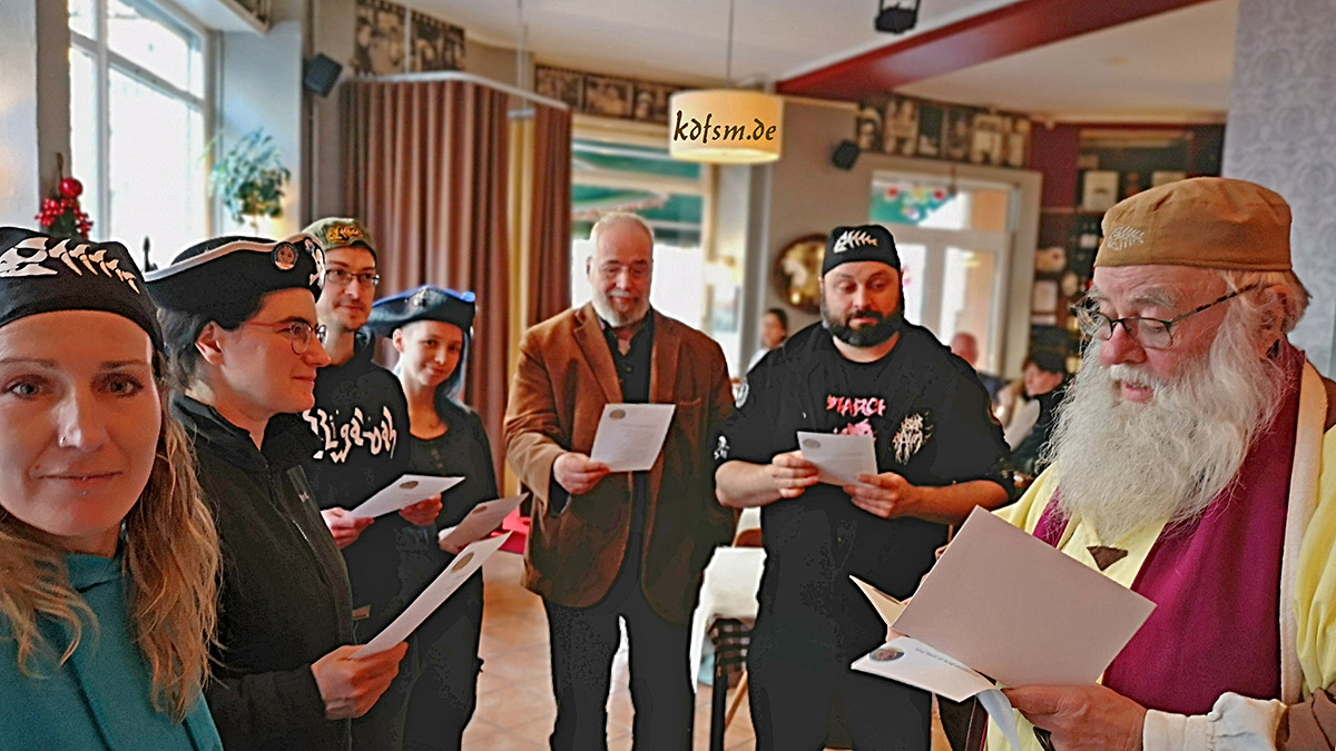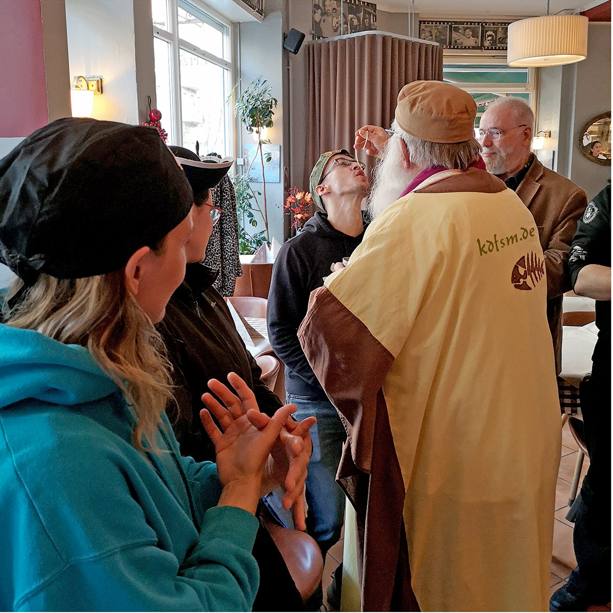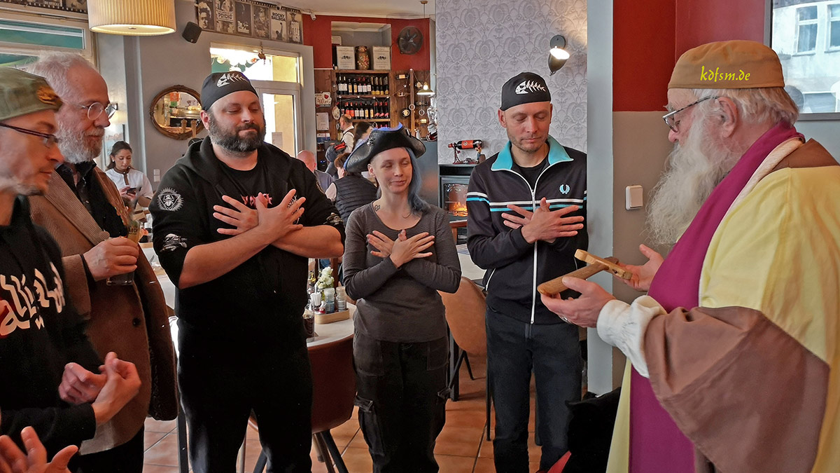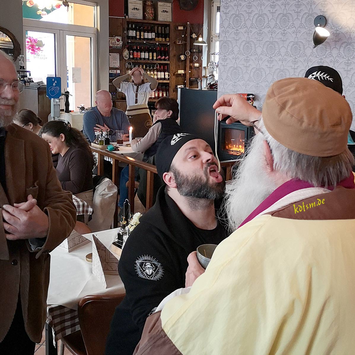 Über die Nudelmesse der Spreeräuber brauche ich sicher nichts mehr zu schreiben. Die lief ab, wie immer. Nur die Reaktion des Publikums war interessant, besonders beim Heiligen Abendmahl. Vom amüsierten Grinsen bis zum fassungslosen Hände über dem Kopf zusammenschlagen war alles dabei.