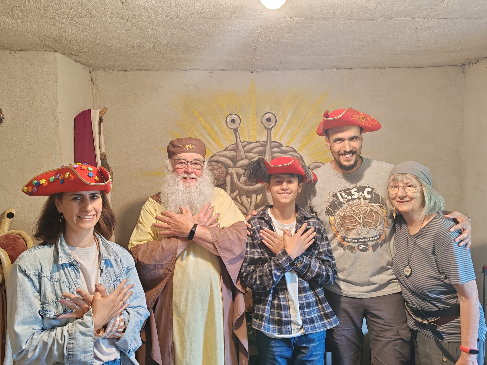 Ich möchte mein Glück mit euch teilen. Gestern besuchten wir als Familie die „Kirche des Fliegenden Spaghettimonsters“ in Röddelin, Templin, und hatten die Ehre, den Heiligen Bruder Spaghettus und seine Frau Elli Spirelli zu treffen, am Nudelmessengottesdienst teilzunehmen, Pasta zu essen und mit ihnen zu plaudern.Die beiden süßesten Menschen auf der Erde, sie mobilisierten sich für unseren Besuch und verwöhnten uns mit ihren unbezahlbaren Geschenken. Wir haben demütig die türkische Erstausgabe des Buches geschenkt. Zwei weitere Familien waren bei der Messe anwesend. Obwohl ich finde, dass Kinder von der Religion ferngehalten werden sollten, freue ich mich auch, dass mein Sohn am richtigen Ort und Zeit in die oberste Philosophie des USC eingeführt wurde.