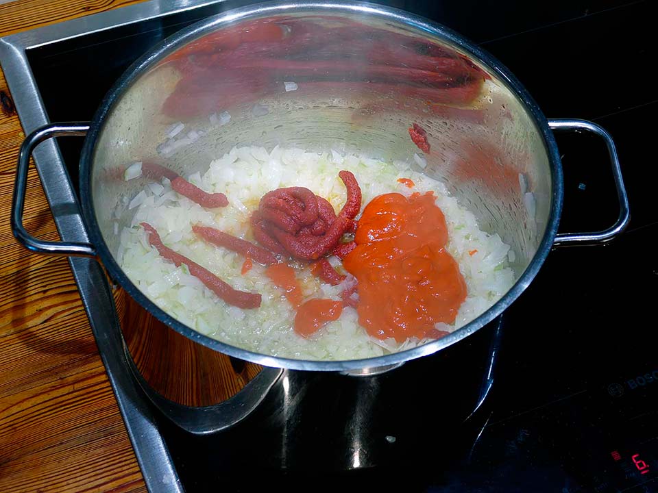 Knoblauch, Tomatenmark und Piros Arany zugeben, verrühren und kurz anschwitzen