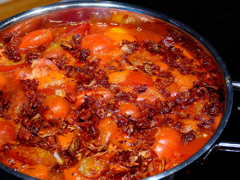 Wenn die Flüssigkeit bis oben gestiegen ist, Deckel abnehmen und gehackte trockene Tomaten dazu.
