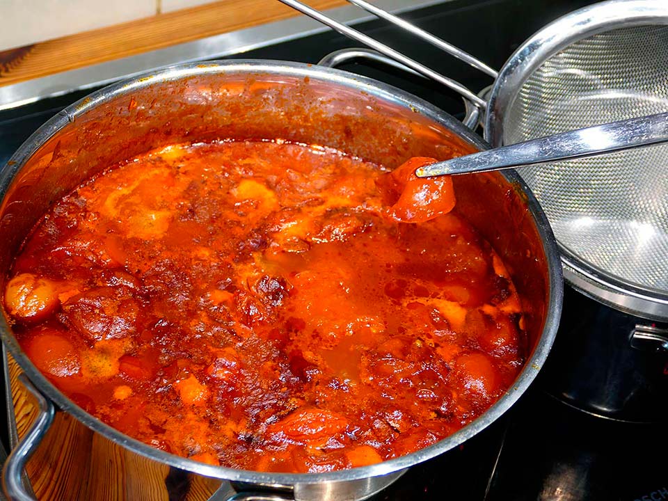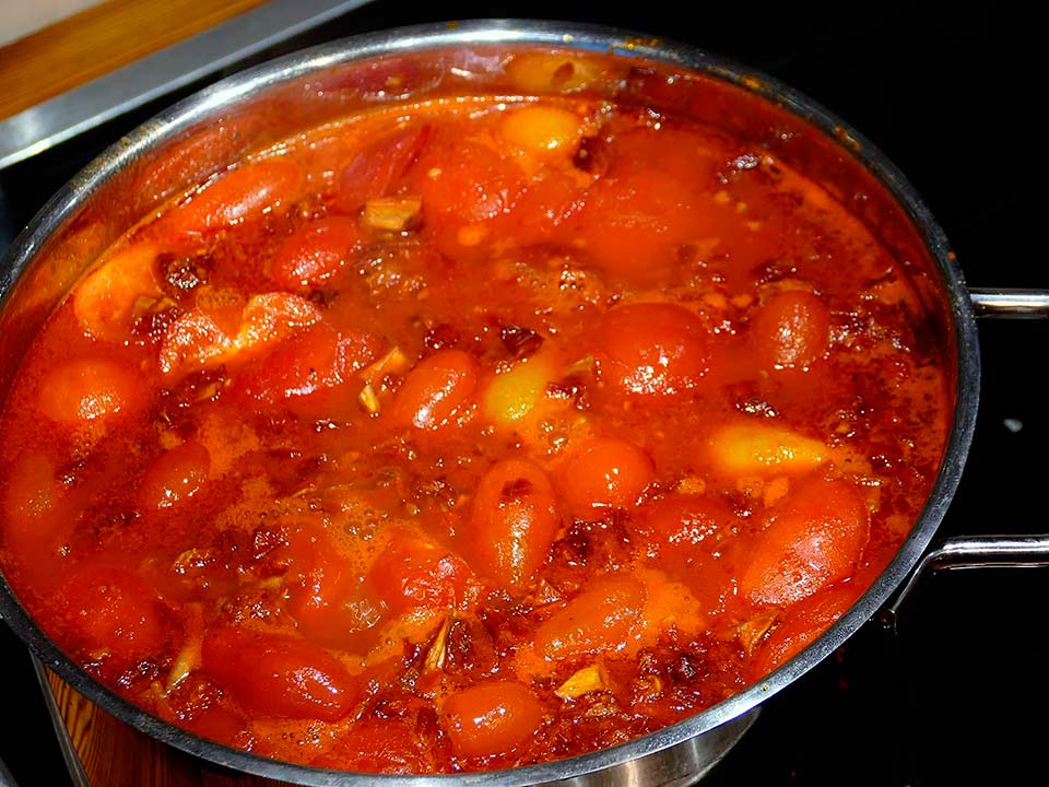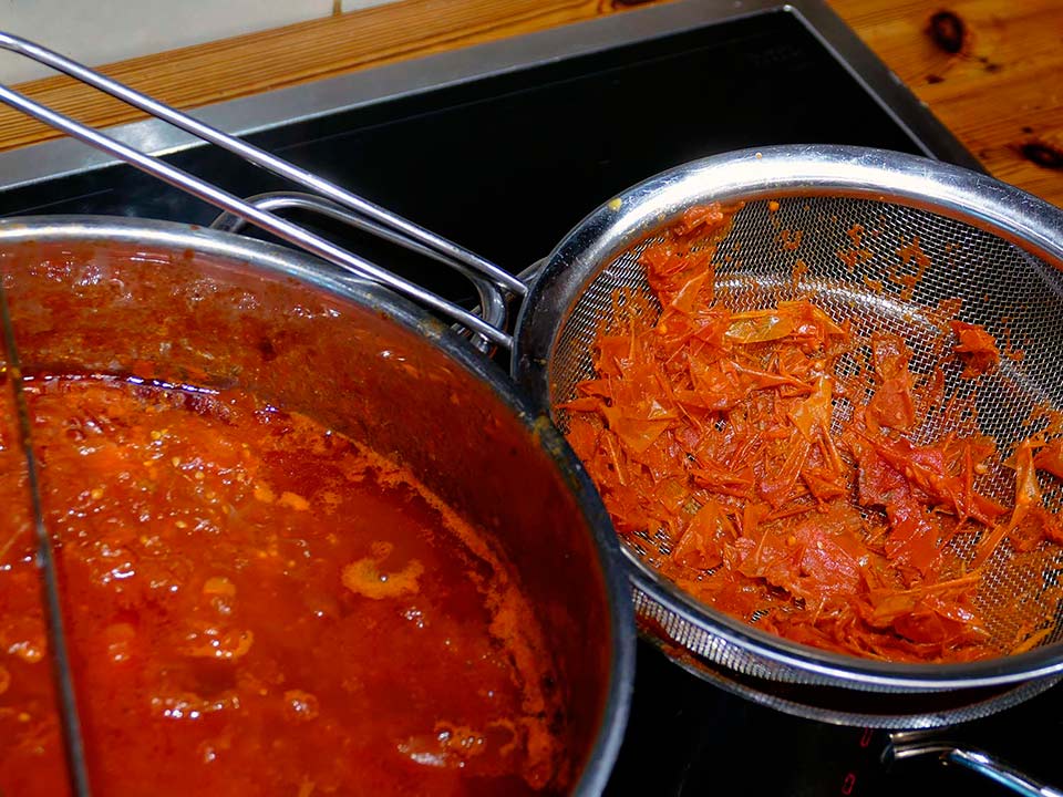 Da ist eine Art Grundanleitung, aber jeder kann selbst experimentieren. Man kann die Gewürze wechseln, man kann die Tomaten vorher schälen, man kann sie stückeln und die kleinen Schalenteile drin lassen, man muss nur ein paar Grundprinzipien beachten: