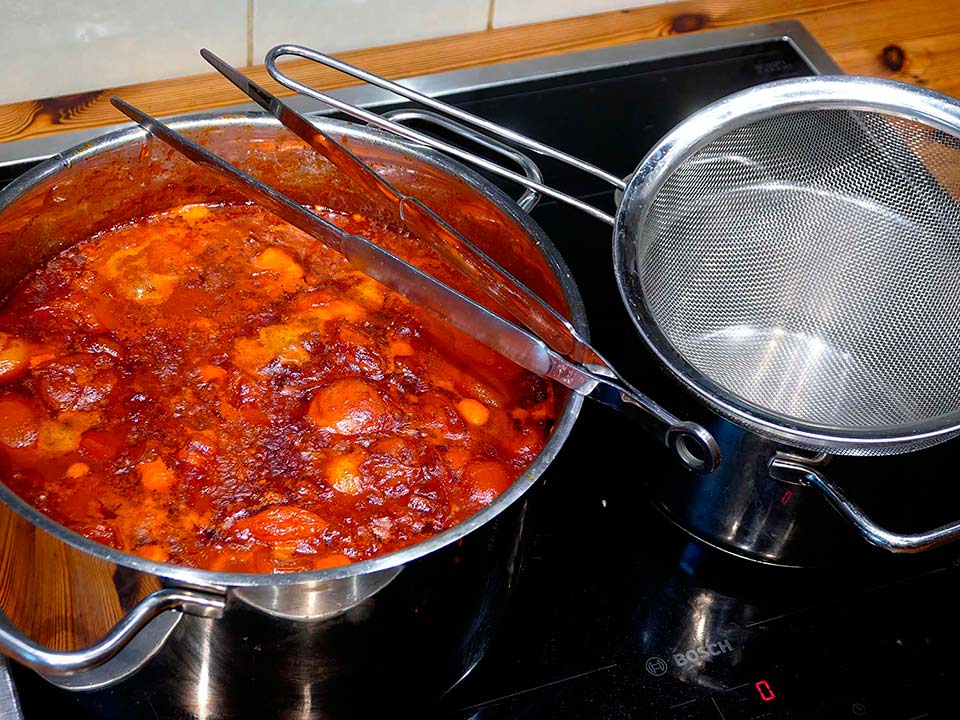 Wenn die Schalen so aussehen, kann vom Sieb vorsichtig das anhängende Mark in dem Topf gestreift werden.