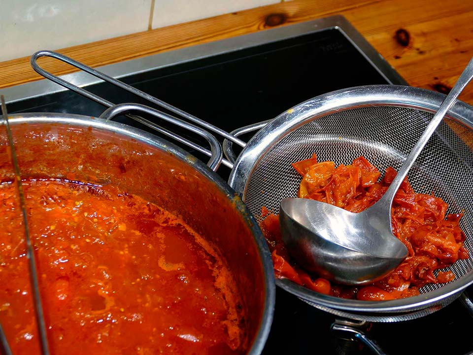 Damit nichts verschwendet wird, werden die Schalen mit der Schöpfkelle durch ein Sieb gedrückt.