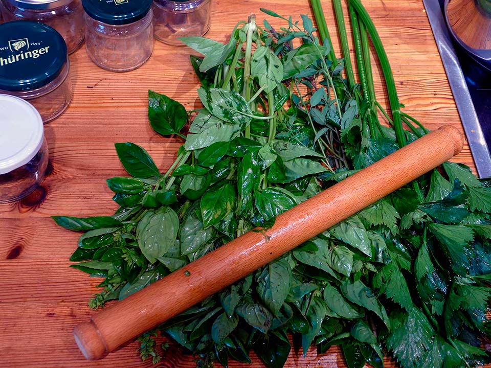 Die frischen Kräuter mit dem Nudelholz anbrechen, damit die ätherischen Öle schneller frei gesetzt werden.