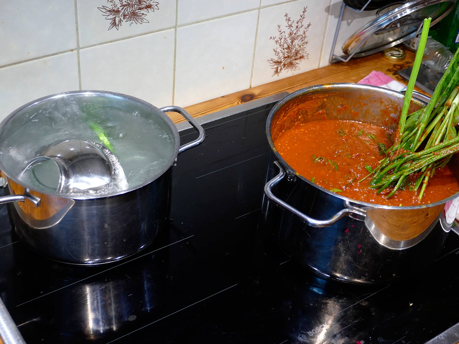 Kräuter heraus nehmen, Erös Pista zugeben und nochmal abschmecken auf Salz, Säure und Schärfe.